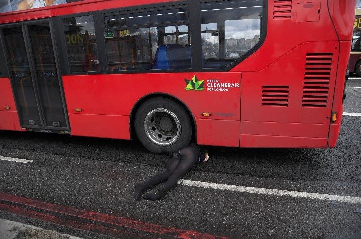 Μία από τις φωτογραφίες εικονίζει μια ανθρώπινη σορό κάτω από τους τροχούς ενός λεωφορείου του Λονδίνου.